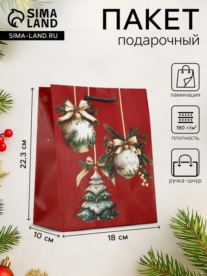 Пакет подарочный новогодний ламинированный, «Ёлки и шары» , 18×10×22.3 см — Характеристики