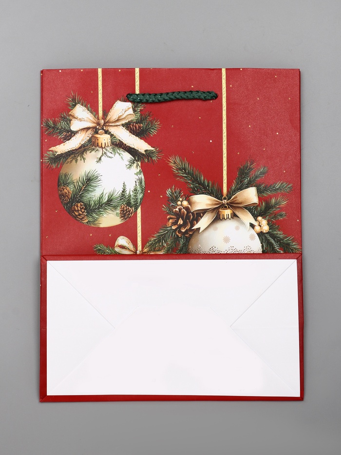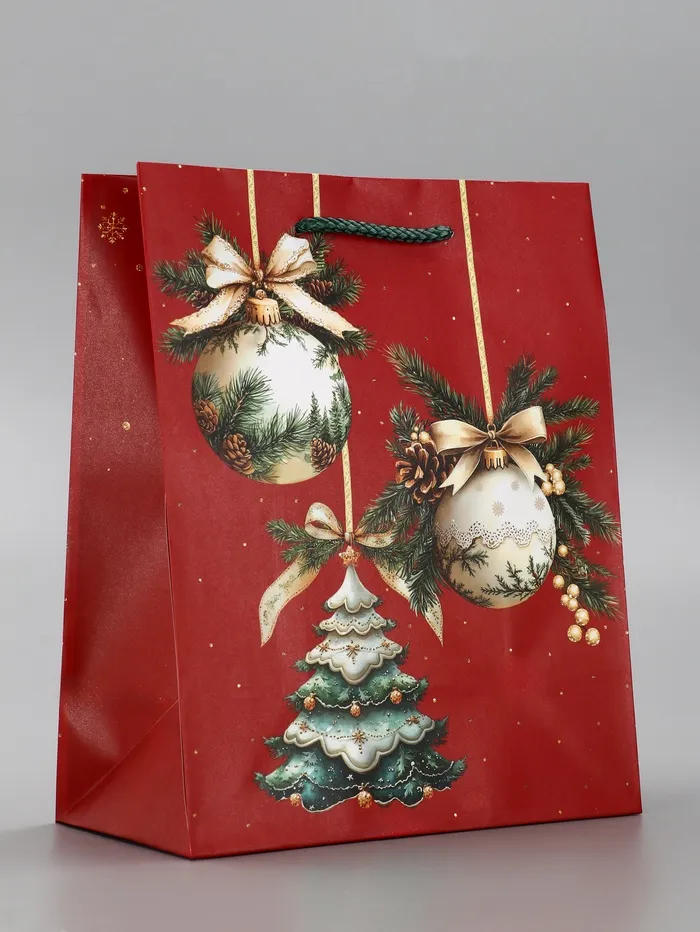 Классика новогоднего праздника! Подарочный пакет «Ёлки и шары» — это традиционное праздничное решение для упаковки подарков. Насыщенный красный и бордовый фон с узором из ёлочных украшений создаёт атмосферу настоящего зимнего торжества.