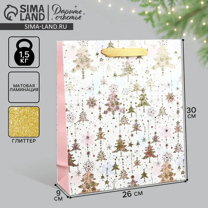 Пакет подарочный новогодний ламинированный «Ёлочки», M 30 х 26 х 9 см — Характеристики