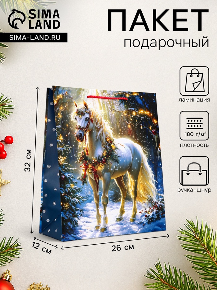 Пакет подарочный новогодний ламинированный, «Конь» , 26×12×32 см — Характеристики