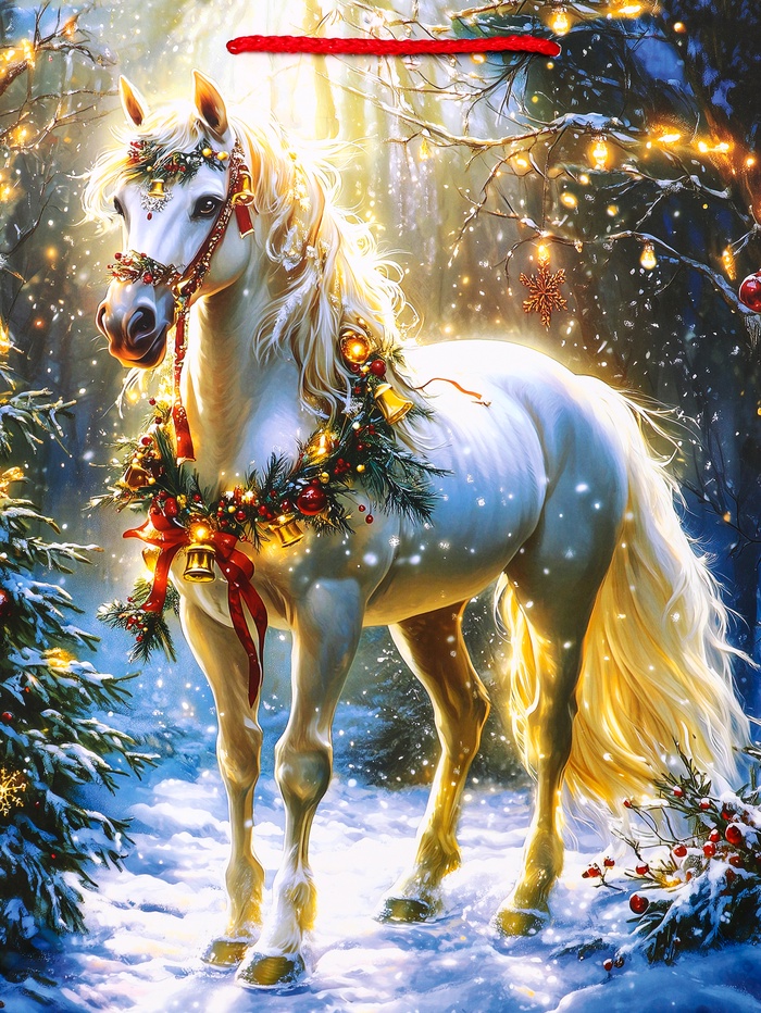 - Динамичный праздничный образ: Изображение скачущего коня в зимней атмосфере передаёт энергию праздника и волшебства. Сочетание синего фона с золотистыми элементами создаёт нарядный и запоминающийся дизайн.