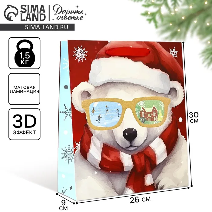 Пакет подарочный новогодний ламинированный «Медвежонок», конгрев, M 30 х 26 х 9 см — Характеристики