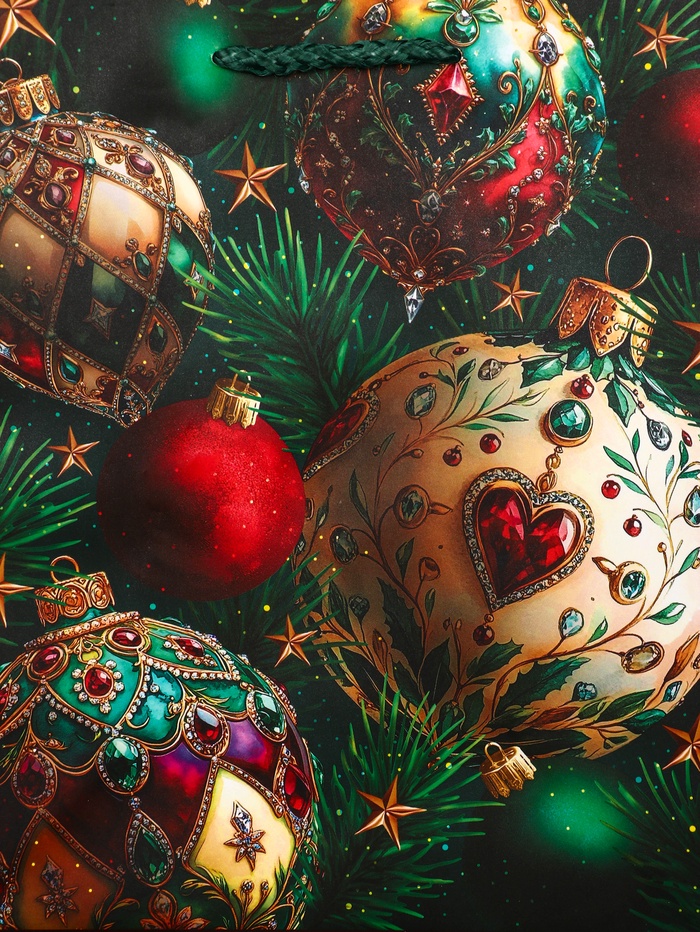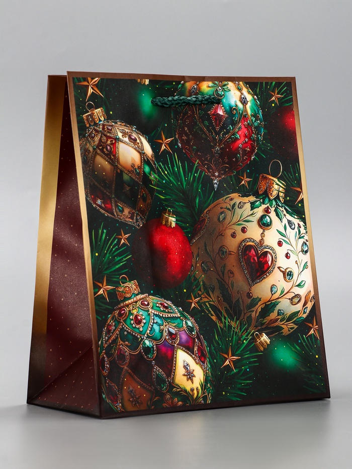 Традиции и стиль в каждой детали! Новогодний подарочный пакет «Праздничный» — это классическое решение для упаковки средних подарков. Его сдержанная цветовая гамма из зеленого и коричневого с изображением елочных шаров создает элегантную праздничную атмосферу, подходящую для подарков любого формата.