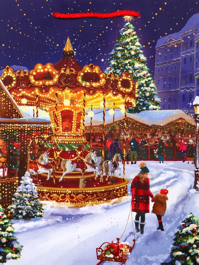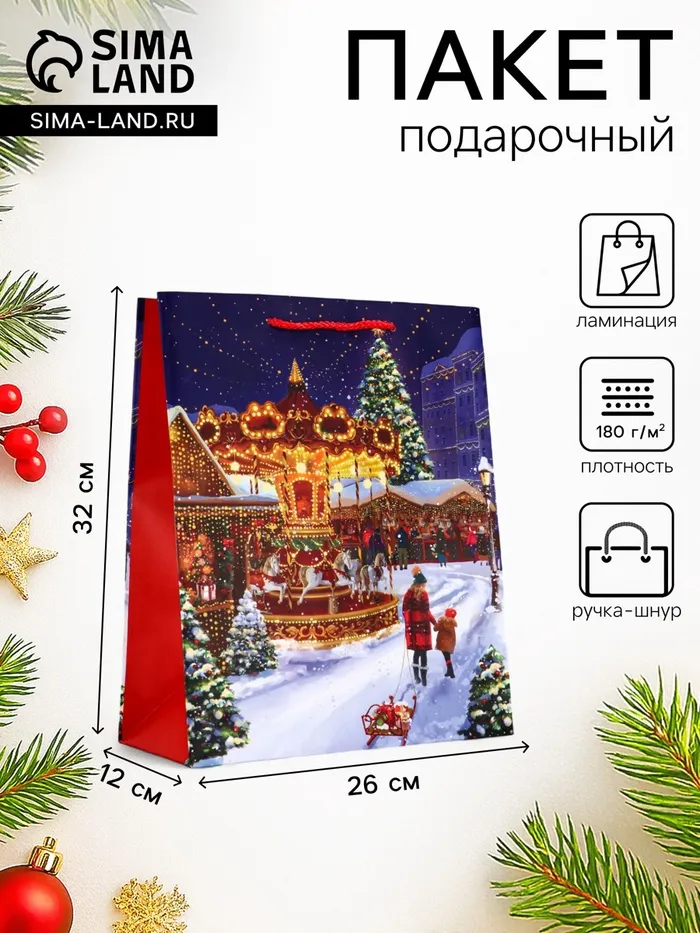 Создайте праздничное настроение с первой секунды! Новогодний подарочный пакет с зимним парком — это ламинированная упаковка с праздничным дизайном. Яркое сочетание красного и синего цветов передает атмосферу зимнего праздника в городском парке с его нарядными елками и сверкающими огнями.