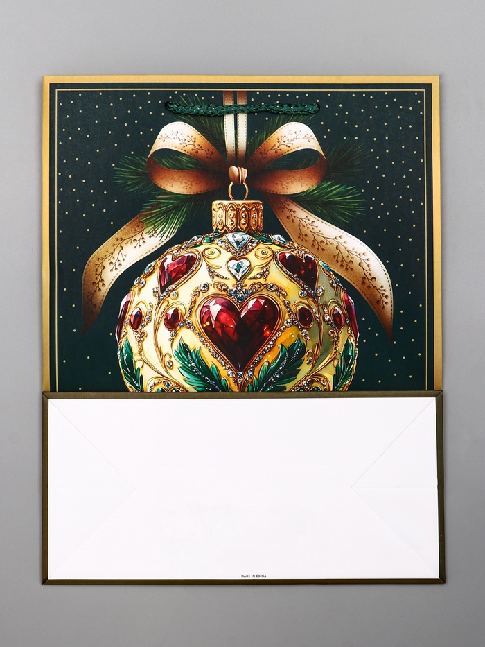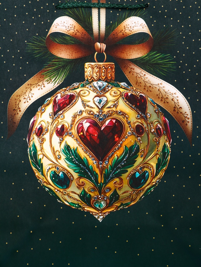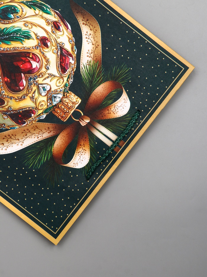 • Классическая новогодняя символика: Узор из елочных шаров на глубоком зеленом фоне — беспроигрышный вариант праздничного дизайна. Такой пакет выглядит нарядно и традиционно, нравится и детям, и взрослым.