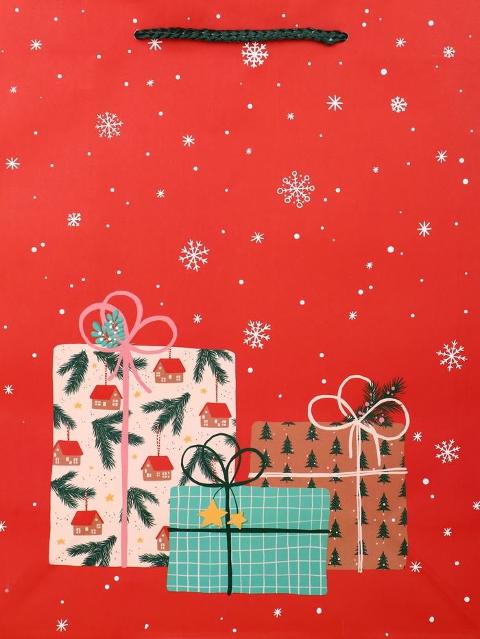 - Традиционный новогодний дизайн: Классический красный цвет и изображение праздничных подарков создают узнаваемую атмосферу Нового года. Универсальный дизайн подходит для подарков всем — от детей до взрослых.