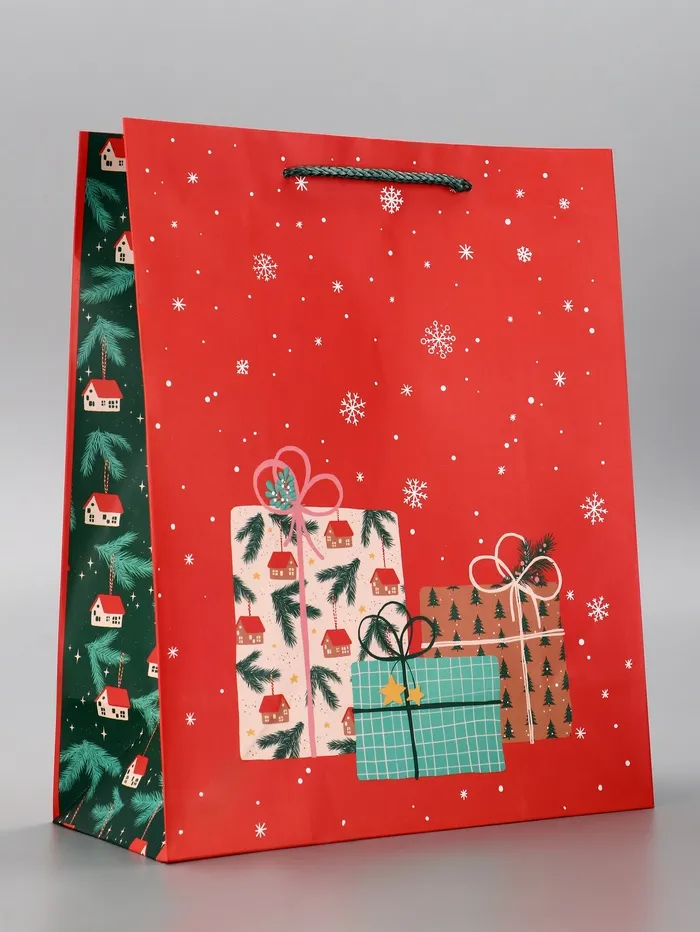 - Готовое праздничное решение: Яркий дизайн с новогодней тематикой не требует дополнительного декора. Пакет сразу создает праздничное настроение и готов к использованию.