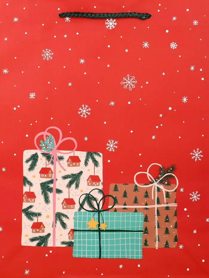- Традиционный новогодний дизайн: Классический красный цвет и изображение праздничных подарков создают узнаваемую атмосферу Нового года. Универсальный дизайн подходит для подарков всем — от детей до взрослых.