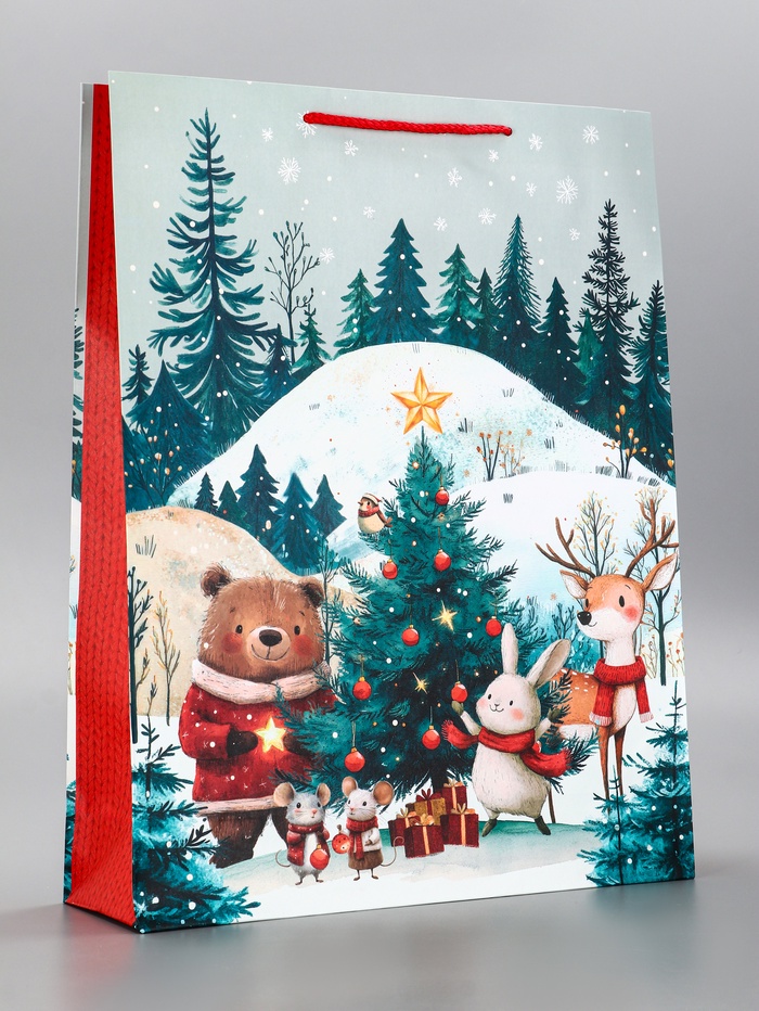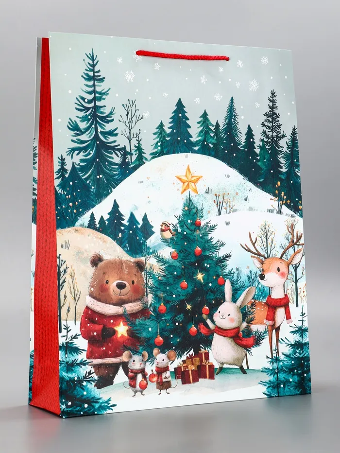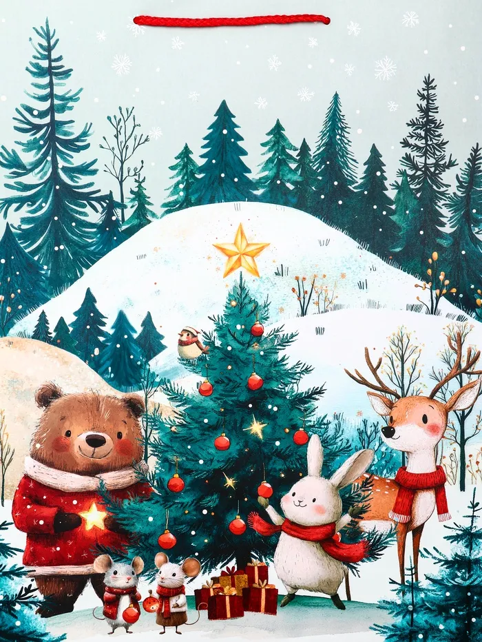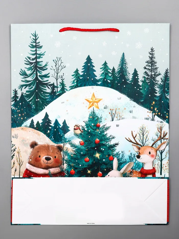 Единство формы и содержания: Этот пакет становится логичным завершением для новогоднего презента — он сам рассказывает историю праздничных традиций. Такая упаковка продлевает ожидание чуда и создает ощущение домашнего тепла даже до момента вручения подарка.