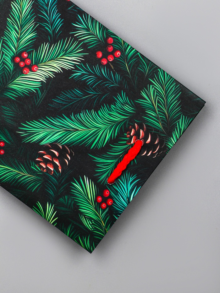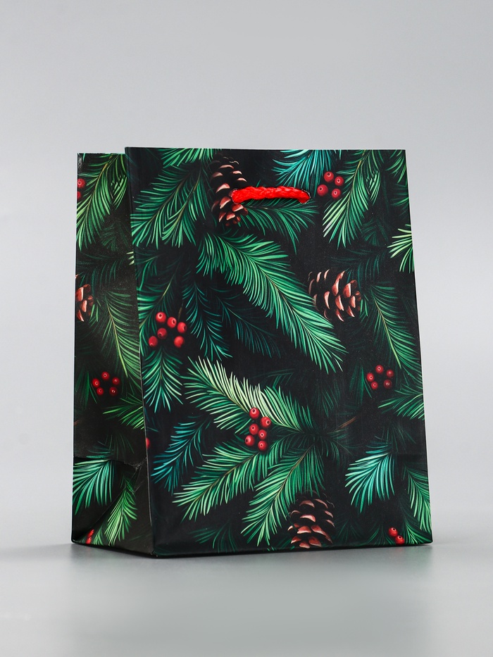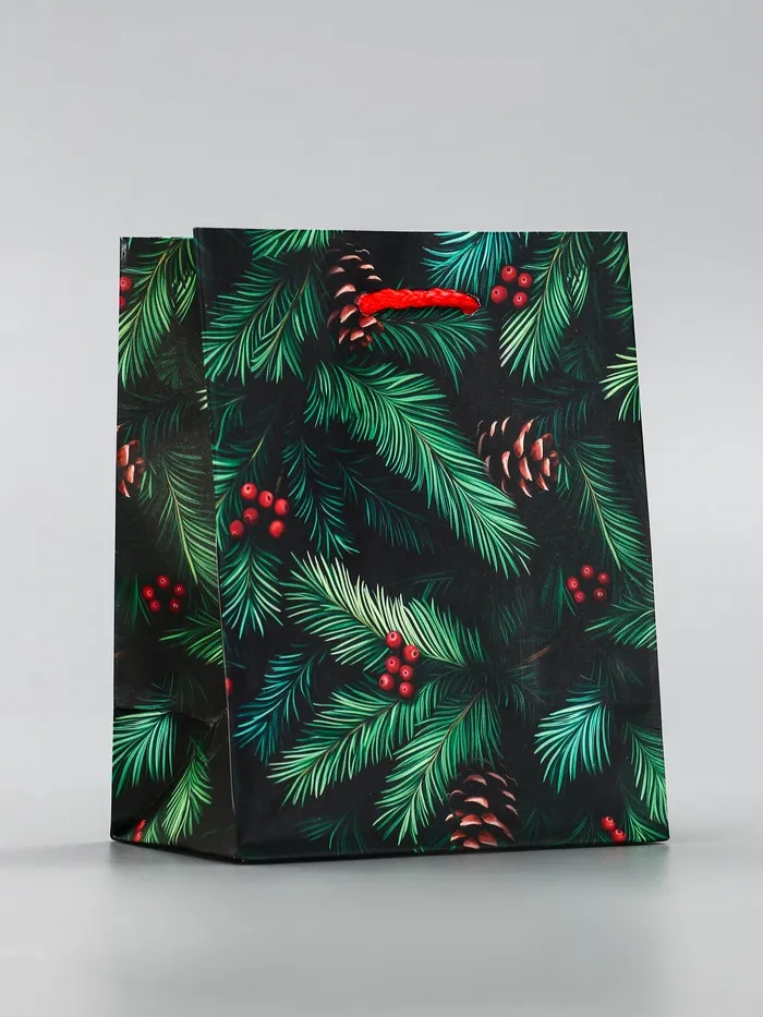 - Нейтральный тематический дизайн: Природная тематика и классическая цветовая гамма делают пакет уместным для подарка мужчине, женщине или ребенку. Рисунок шишек ассоциируется с зимним лесом и новогодними праздниками.
