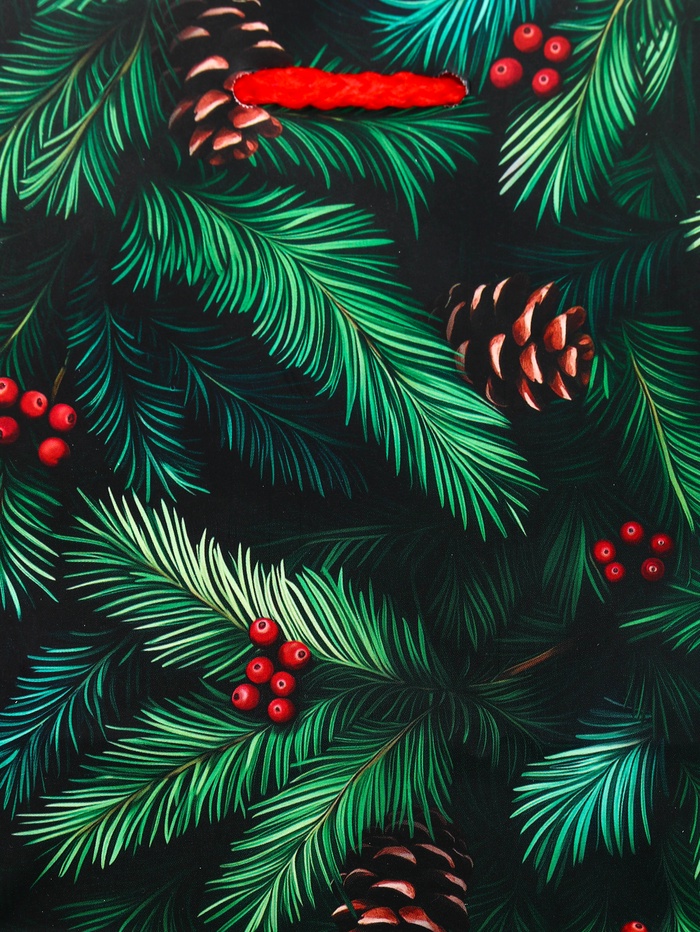 Природное очарование зимнего леса! Новогодний подарочный пакет «Шишки» — это упаковка для тех, кто ценит естественную красоту и лаконичность. Глубокий зеленый фон с графичным изображением лесных шишек создает ощущение уютной зимней сказки, делая даже небольшой подарок значимым и стильным.