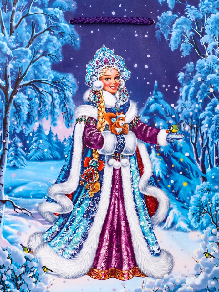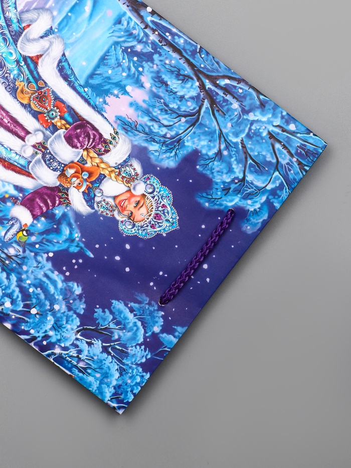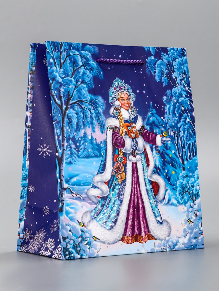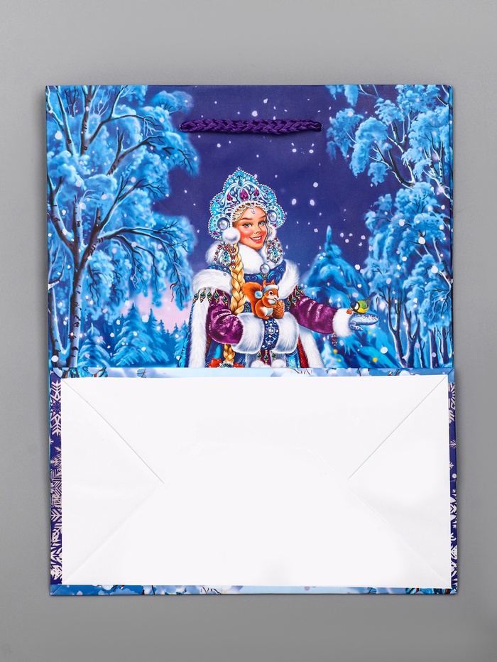 • Универсальный синий дизайн: Классическое зимнее оформление с Снегурочкой на синем фоне делает пакет отличным выбором для подарка и девочке, и мальчику. Дизайн создает ощущение праздника и волшебства.