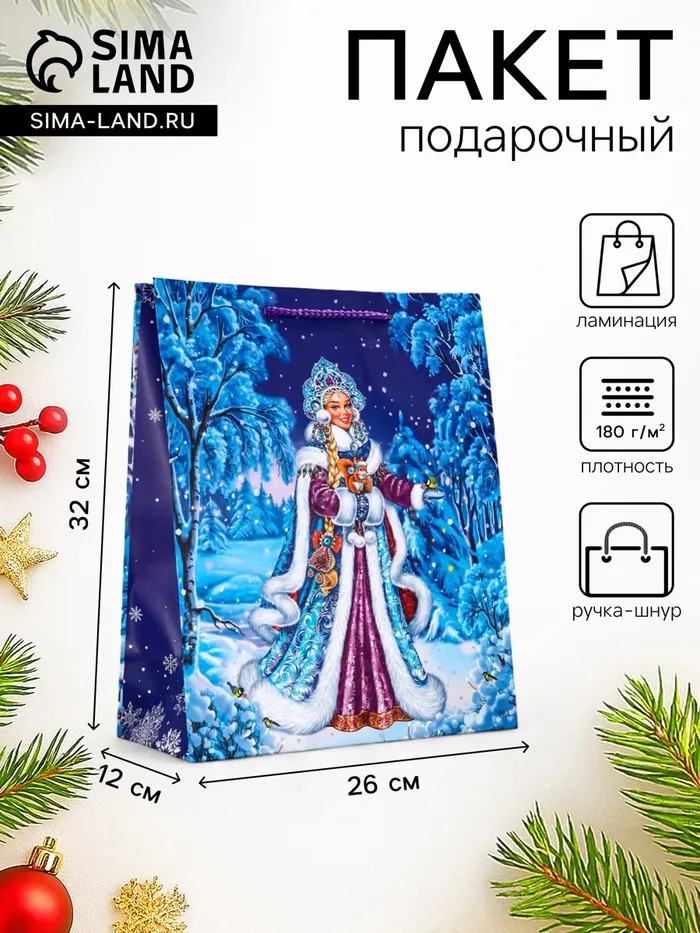 Пакет подарочный новогодний ламинированный, «Снегурочка» , 26×12×32 см — Характеристики