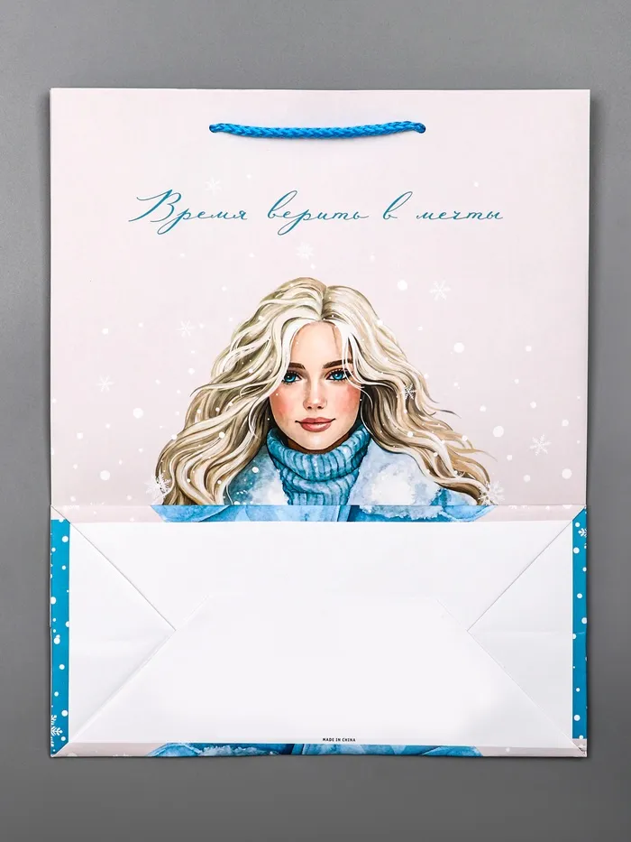 Время дарить волшебство! Новогодний подарочный пакет «Время верить в мечты» — это ламинированная упаковка с зимним дизайном. Светлые тона и вдохновляющая надпись создают ощущение сказки, а прочные шнуры-ручки выдерживают вес даже объемных подарков.