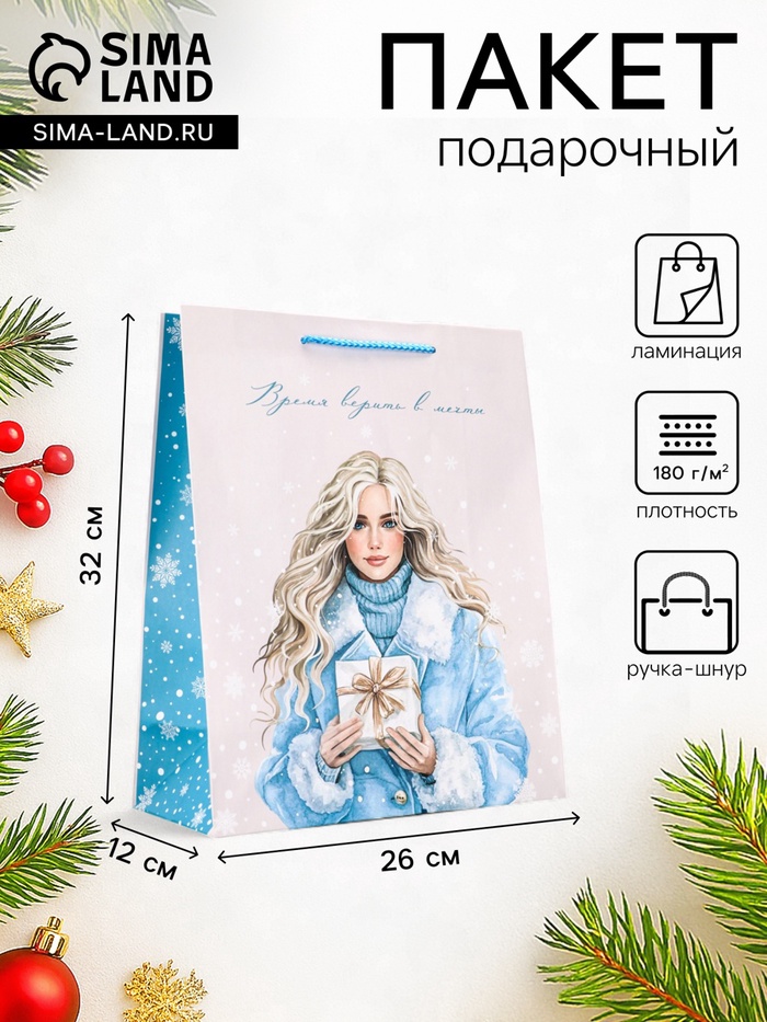 Пакет подарочный новогодний ламинированный, «Время верить в мечты» , 26×12×32 см — Характеристики
