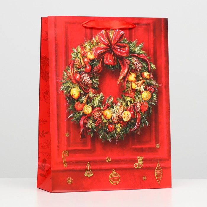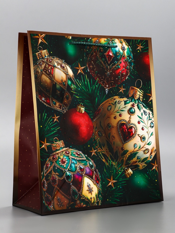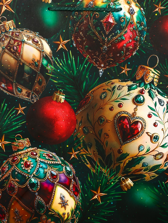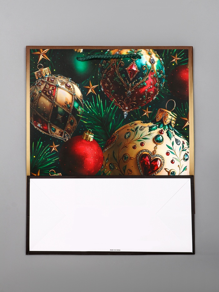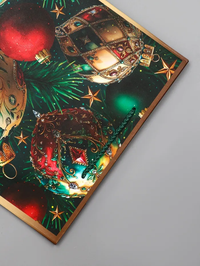 - Роскошное золотое оформление: Дизайн с золотистыми елочными шарами на изумрудном фоне выглядит по-праздничному богато. Такой пакет не требует дополнительного декора — он сам создает атмосферу торжества.