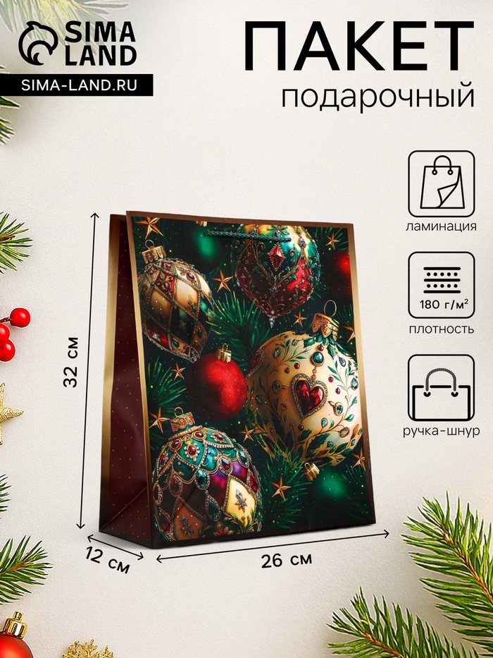 Пакет подарочный новогодний ламинированный, «Золотые ёлочные шары» , 26×12×32 см — Характеристики