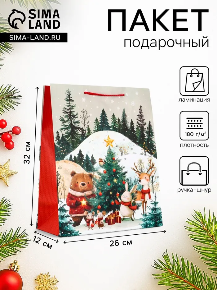 Пакет подарочный новогодний ламинированный, «Зверята наряжают ёлку» , 26×12×32 см — Характеристики