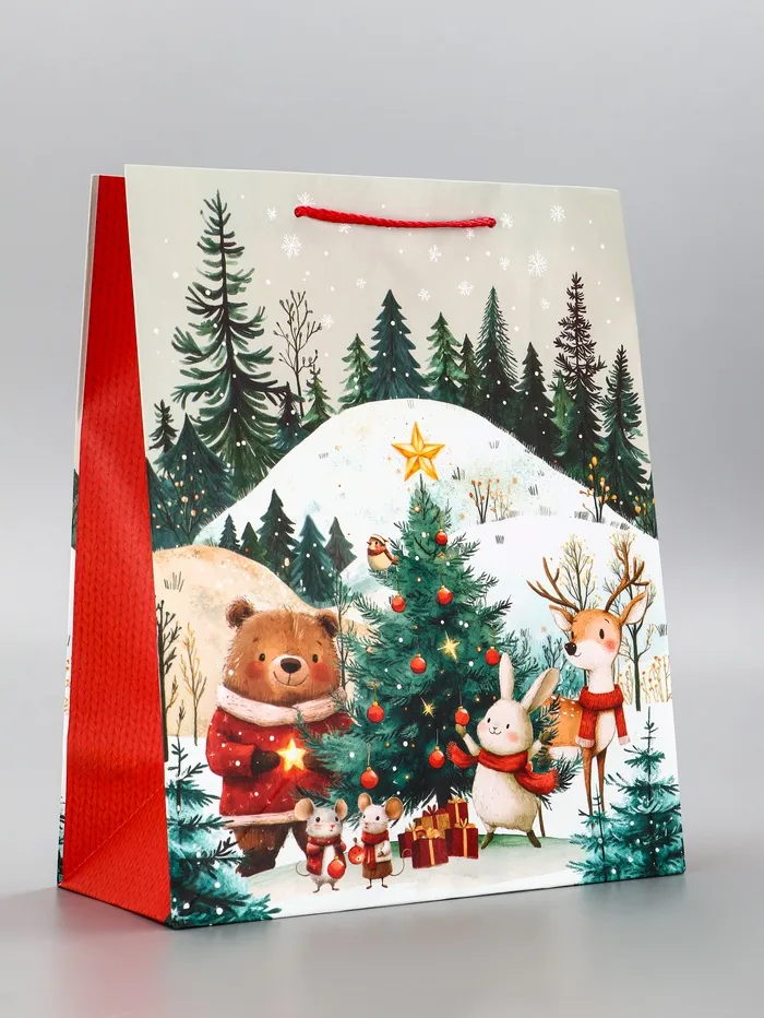 Подарите улыбку и новогоднее настроение! Новогодний подарочный пакет с животными — это ламинированная упаковка с милым дизайном. Забавные зверята, наряжающие елку, создают добрую праздничную атмосферу и вызывают улыбку у детей и взрослых.