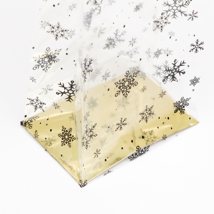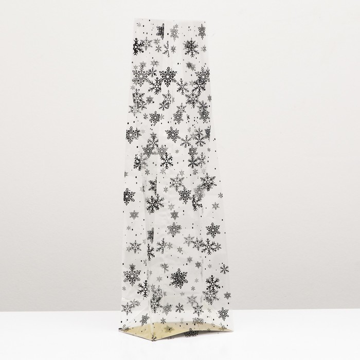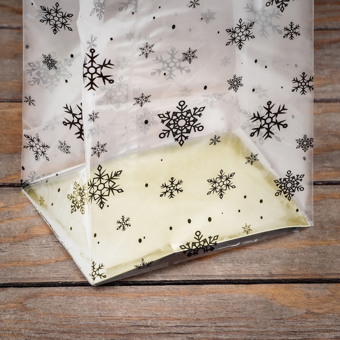 Прозрачный пакет с жёстким дном, украшенный рисунком снежинок - достаточно прочный, экономичный и стильный. Его используют для упаковки сладостей, фруктов, а так же косметических наборов и многого другого. Идеальный выбор для оформления новогодних подарков. Как вариант, упаковку можно перевязать бантиком.