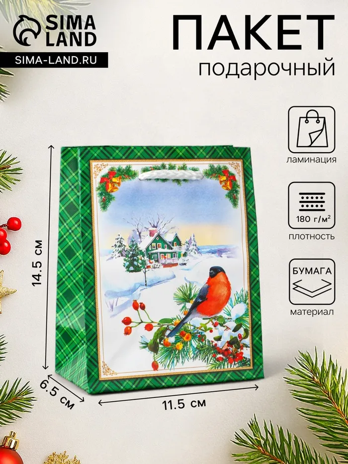 Пакет подарочный новогодний «Снегирь на ветке», 11.5×14.5×6.5 см — Характеристики