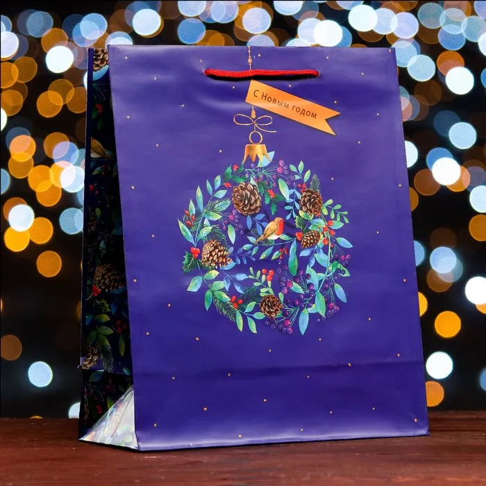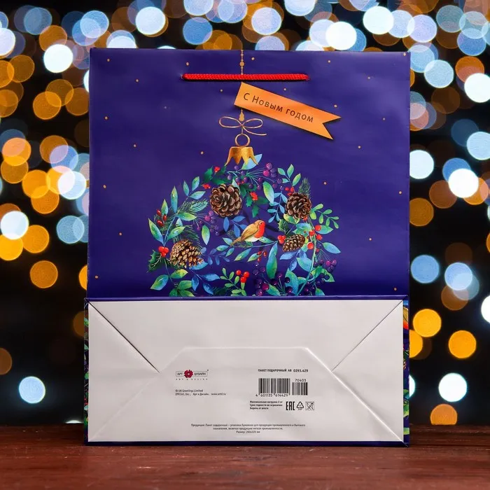 Новогодний подарочный пакет с ярким, красочным рисунком создаст праздничное настроение.