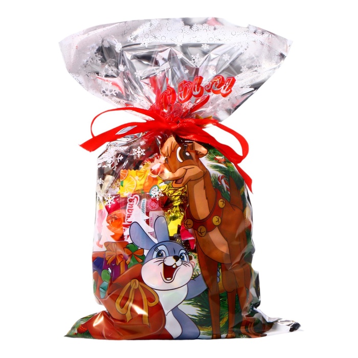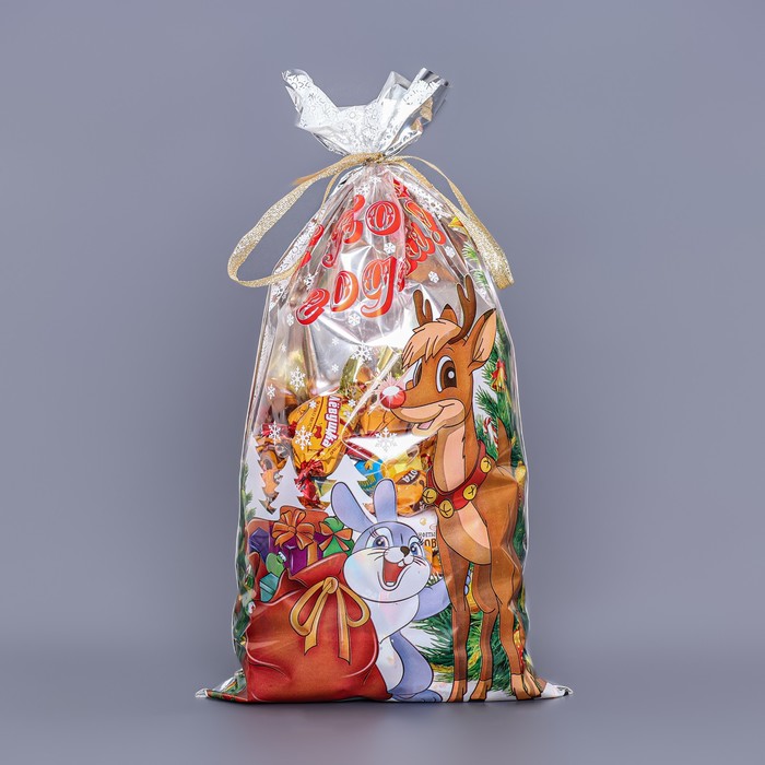 Новогодний подарочный пакет с ярким, красочным рисунком создаст праздничное настроение.