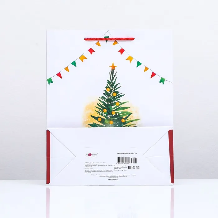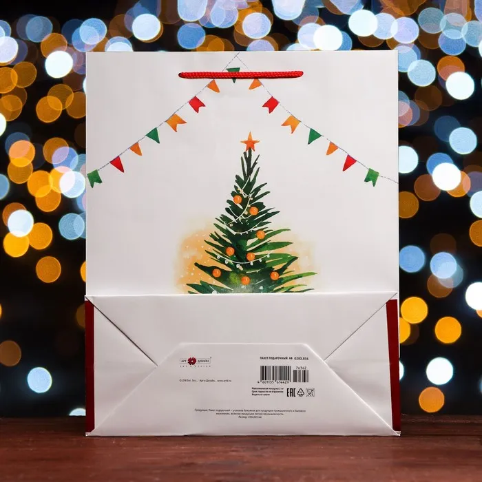 Новогодний подарочный пакет с ярким, красочным рисунком создаст праздничное настроение.