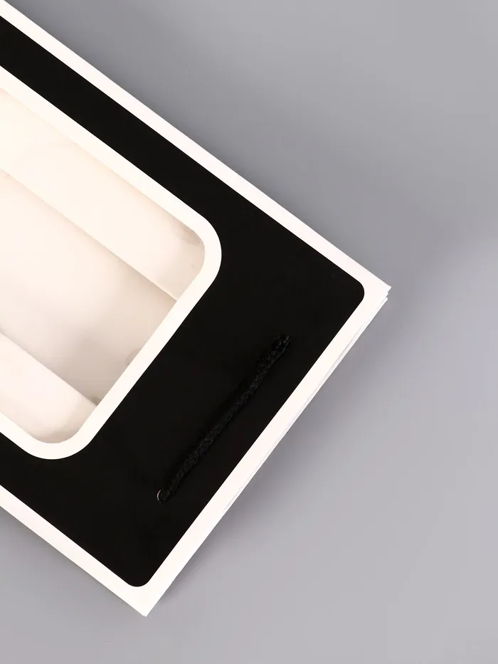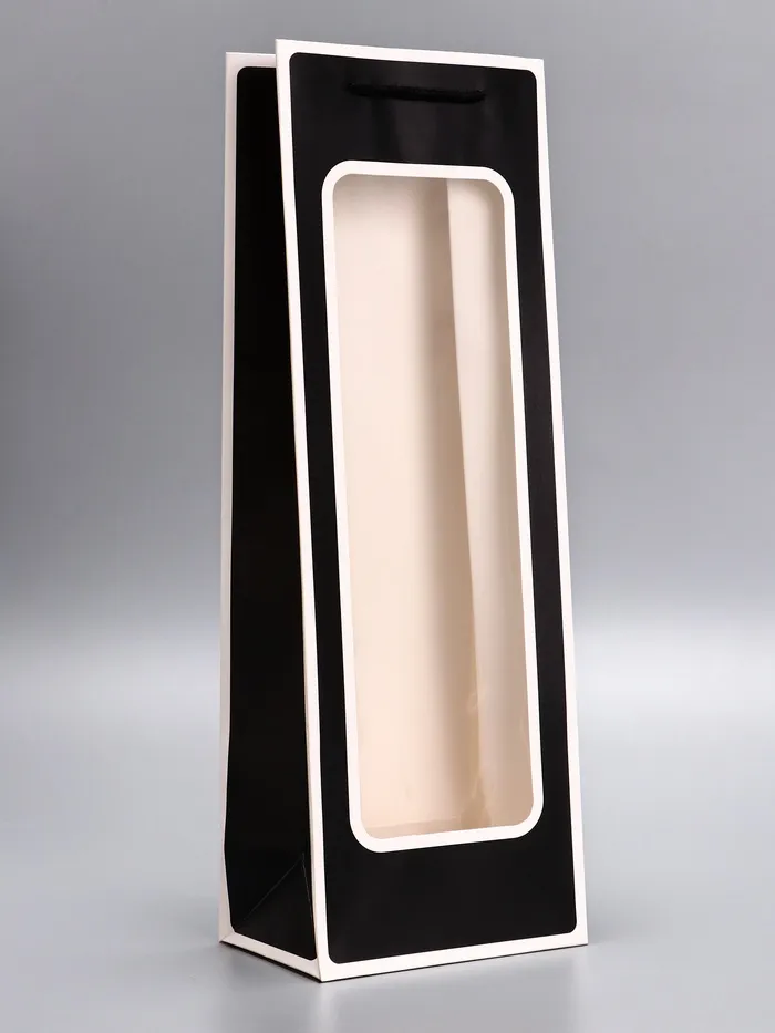 Контрастный стиль для изысканных подарков! Чёрный подарочный пакет для бутылки с белой каймой и прозрачным окном — лаконичное решение с выразительным дизайном. Сочетание глубокого чёрного с чёткой белой окантовкой создаёт современный образ, а прозрачная вставка показывает содержимое.