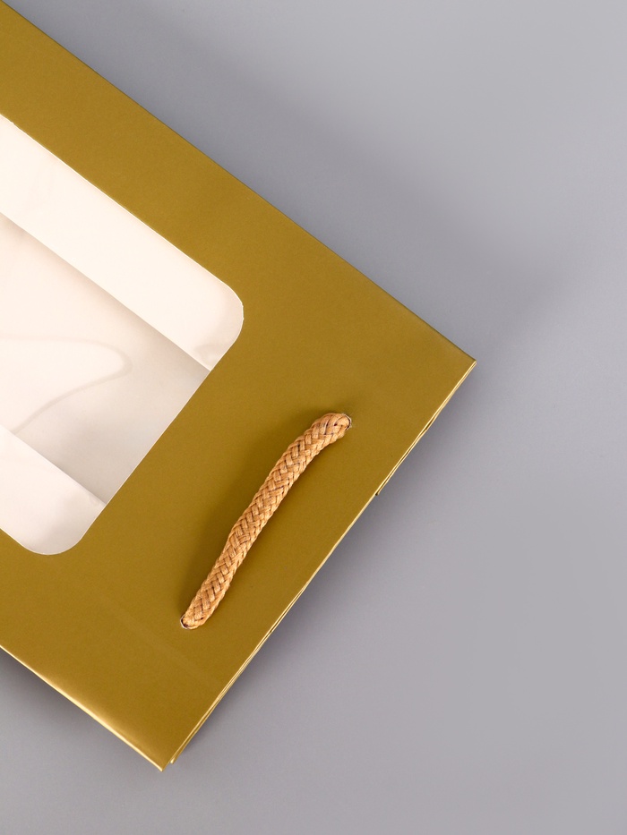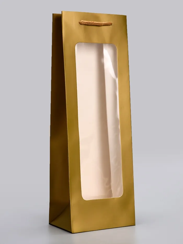 Королевская упаковка для благородных напитков! Золотой подарочный пакет для бутылки с прозрачным окном — роскошное решение для особенных подарков. Благородный золотистый оттенок подчеркивает ценность содержимого, а прозрачная вставка демонстрирует бутылку.