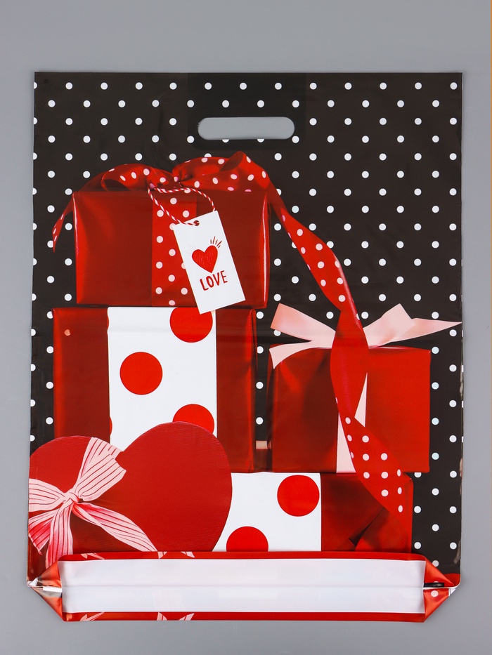 Праздник как перформанс: Этот пакет не стесняется своей роли. Он собирает все возможные символы подарка и любви в одном месте, создавая эффект праздничного изобилия и радости. Это упаковка для тех случаев, когда важно не просто вручить подарок, а устроить маленькое шоу.
