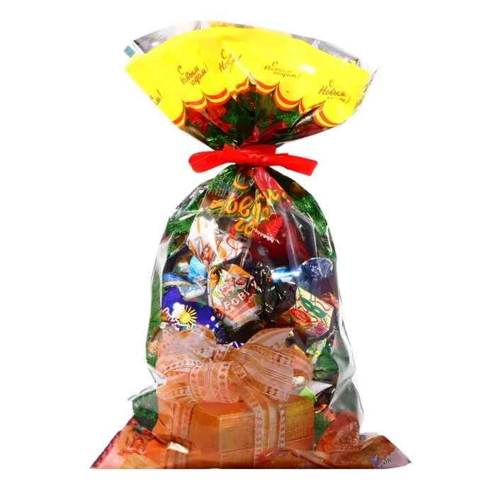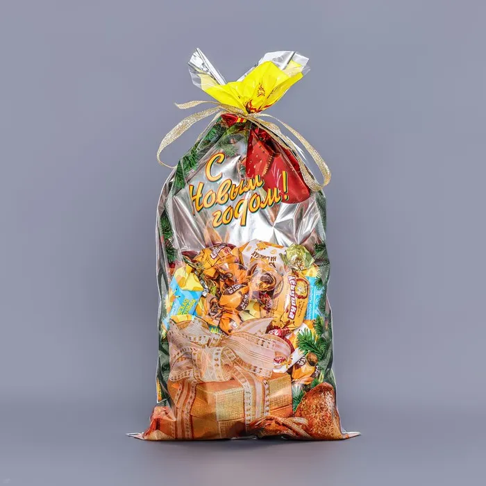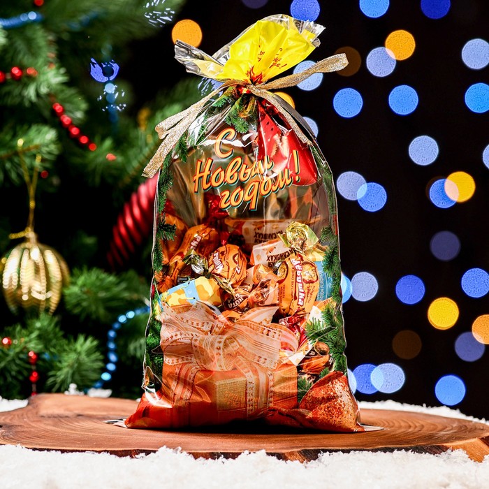 Новогодний подарочный пакет с ярким, красочным рисунком создаст праздничное настроение.