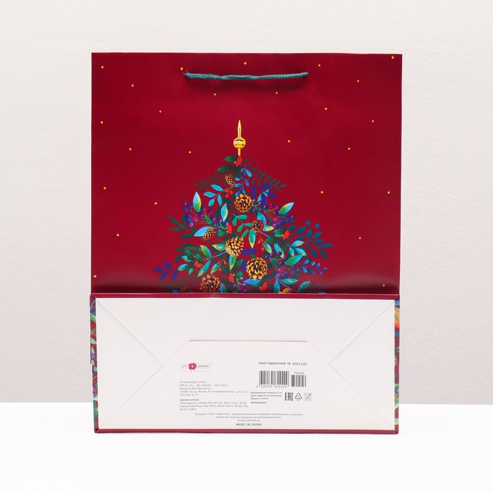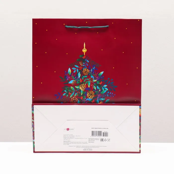 Новогодний подарочный пакет с ярким, красочным рисунком создаст праздничное настроение.