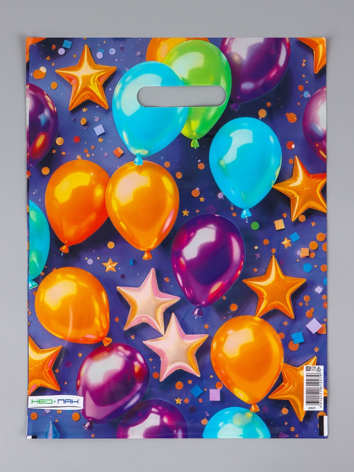 - Праздничный и динамичный дизайн: Яркое изображение воздушных шаров, звёзд и конфетти создаёт атмосферу карнавала и беззаботного веселья. Такой пакет идеально подходит для подарков на день рождения, Новый год или любой другой радостный повод.