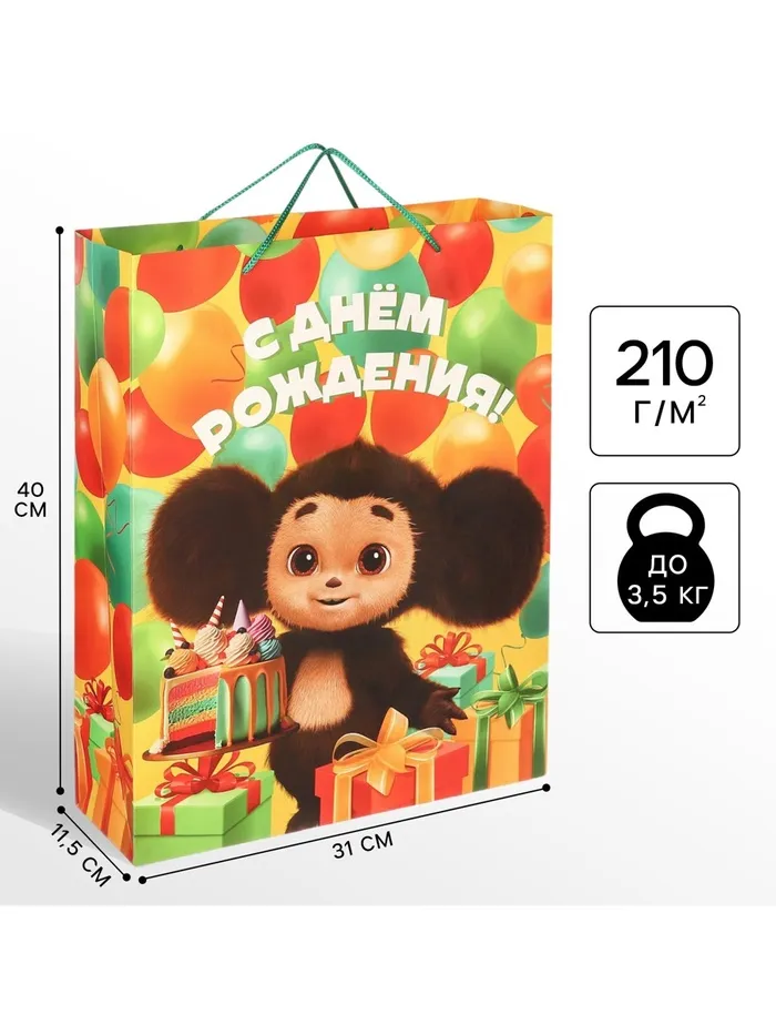Пакет подарочный «С днём рождения», 31×40×11.5 см, упаковка, Чебурашка — Характеристики