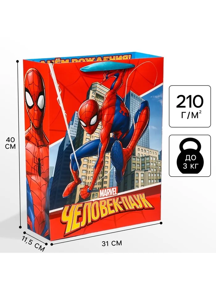 Пакет подарочный «С днём рождения», 31×40×11.5 см, упаковка, Человек-паук — Характеристики