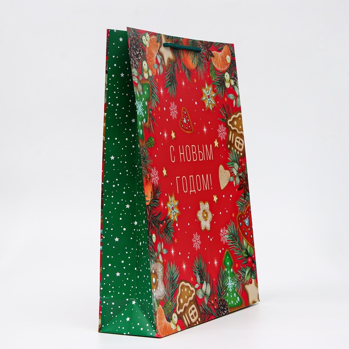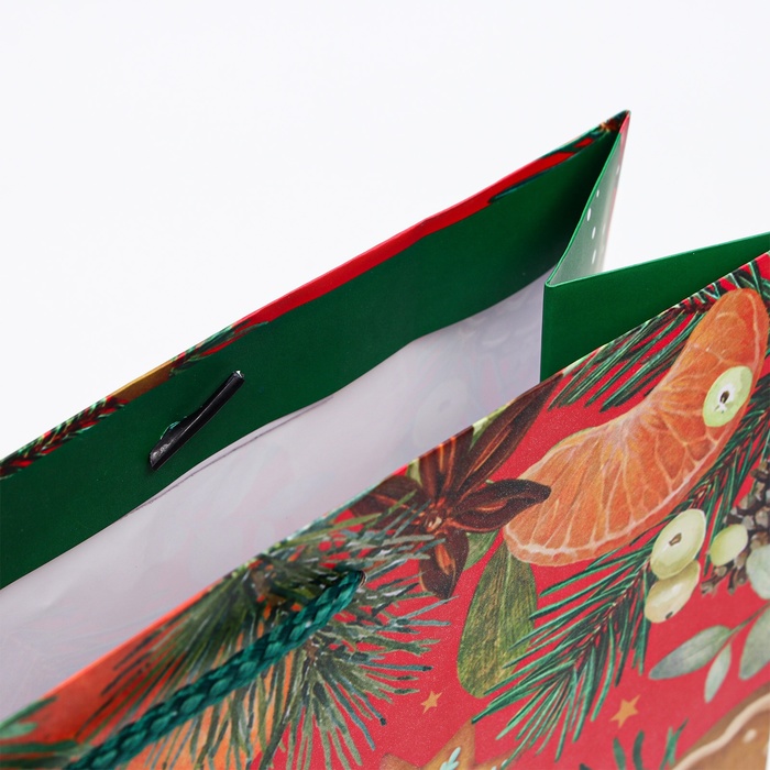 Подарочный новогодний пакет имеет оптимальные размеры, позволяющие упаковать различные предметы, от небольших сувениров до крупных подарков. Он также может быть использован для хранения и транспортировки продуктов питания, например сладких подарков под ёлку, так как материал, из которого он изготовлен, является безопасным для контакта с пищевыми продуктами.