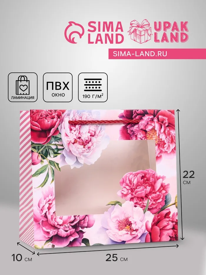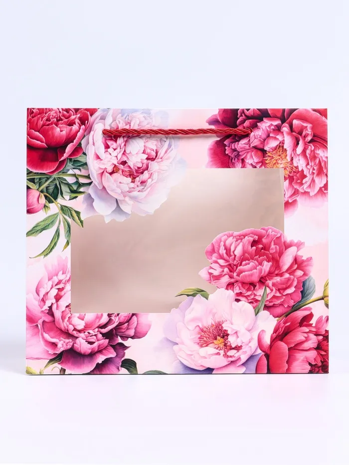 Подарочный пакет с окошком в стиле «Пионы» — это изящное решение для упаковки подарков к женским праздникам или торжественным событиям. Его нежный розовый оттенок и цветочный дизайн создают атмосферу весеннего настроения, а удобная форма и прочная конструкция делают его практичным выбором для подарков.