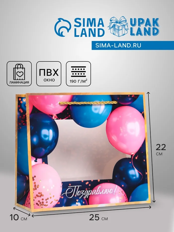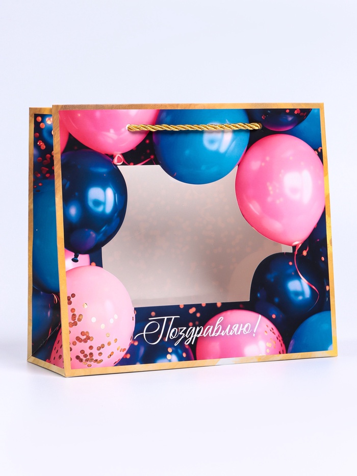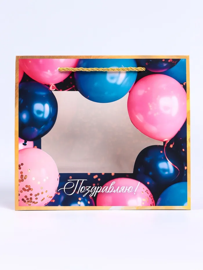 Праздничный пакет с окошком «Поздравляю» — это яркий и универсальный аксессуар для упаковки подарков на день рождения или юбилей. Его дизайн с воздушными шарами, конфетти и праздничными надписями создаёт атмосферу веселья и торжества, а удобная форма и прочная конструкция делают его практичным выбором для любого подарка.