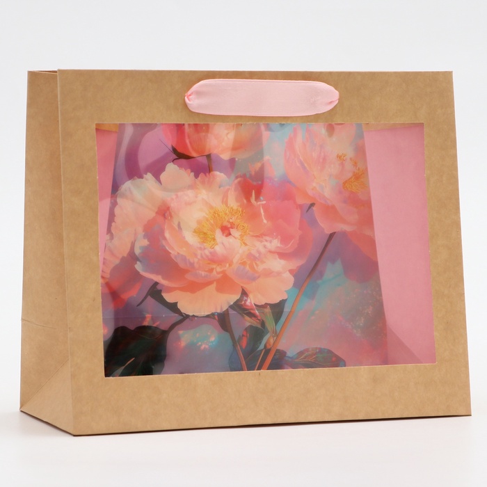 Пакет подарочный с PVC окном, «Пионы», 24×11×20 см