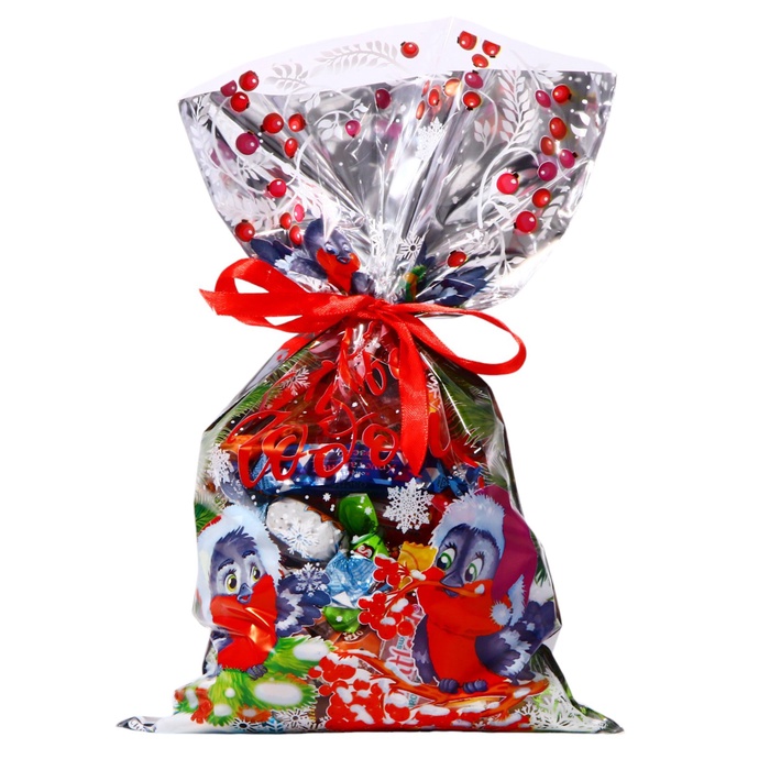 Новогодний подарочный пакет с ярким, красочным рисунком создаст праздничное настроение.