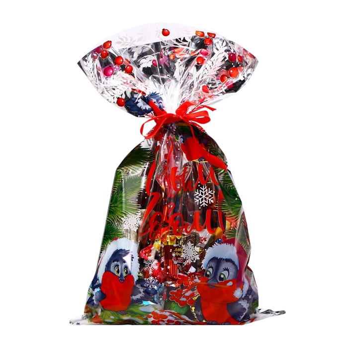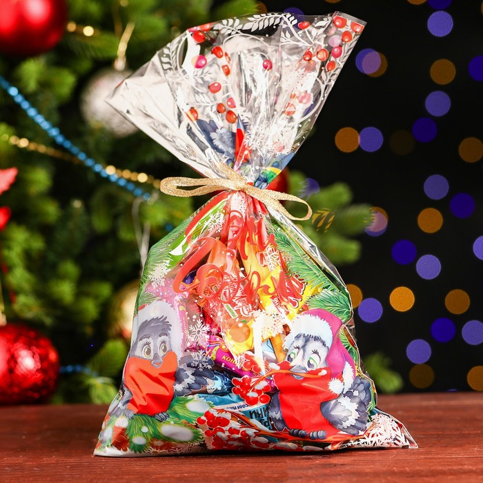 Новогодний подарочный пакет с ярким, красочным рисунком создаст праздничное настроение.