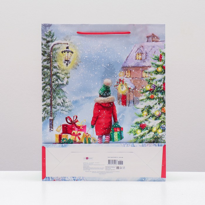 Новогодний подарочный пакет с ярким, красочным рисунком создаст праздничное настроение.