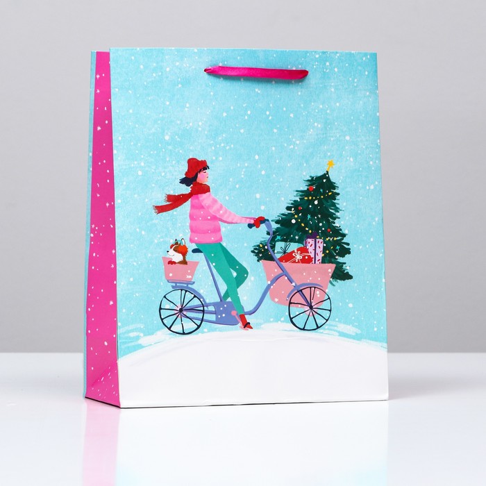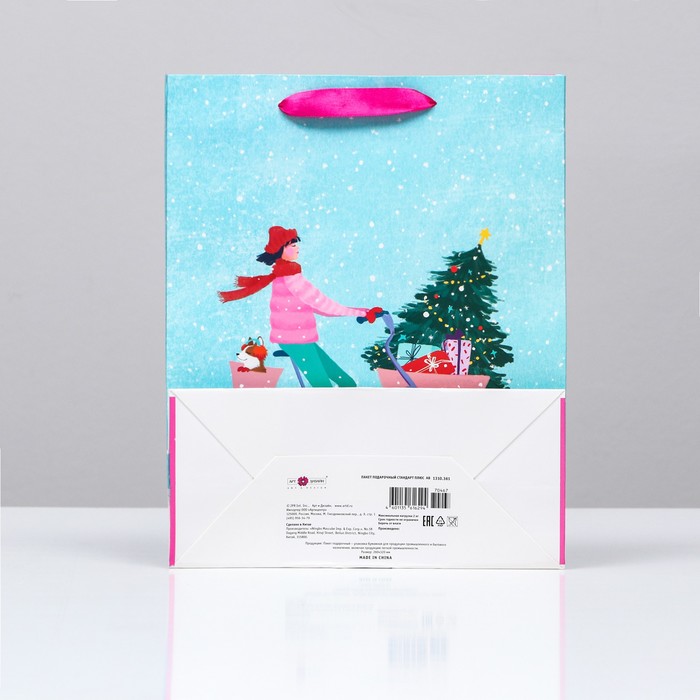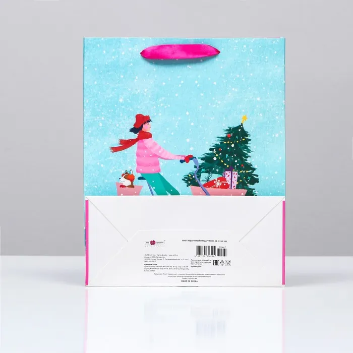 Новогодний подарочный пакет с ярким, красочным рисунком создаст праздничное настроение.