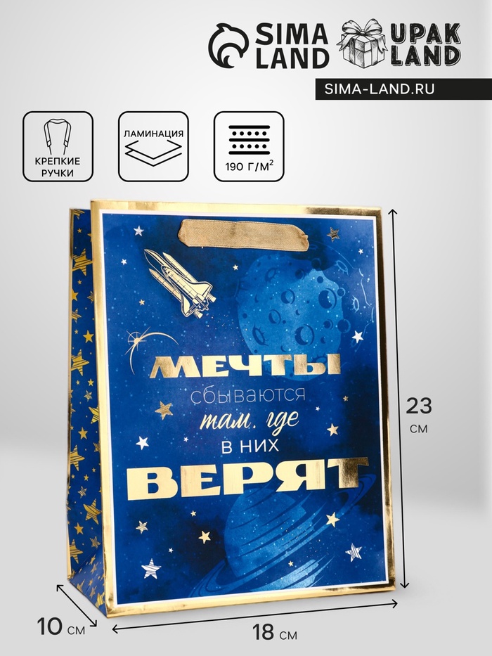 Пакет подарочный вертикальный "Мечты сбываются там, где в них верят", 18×23×10 см — Характеристики