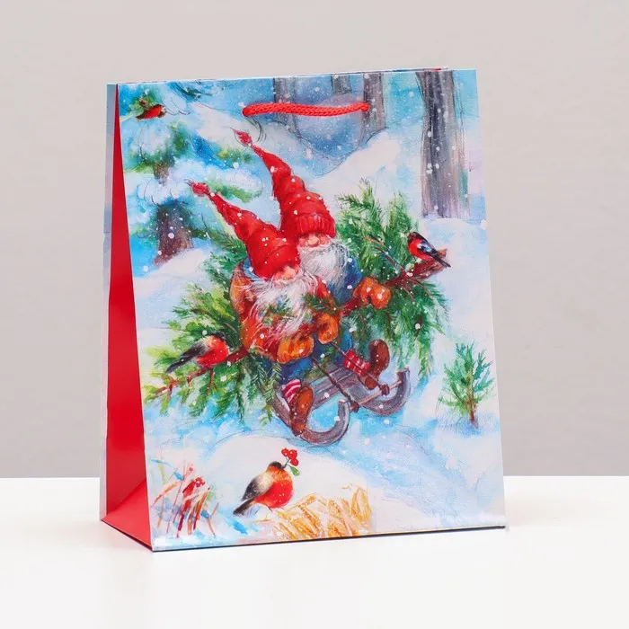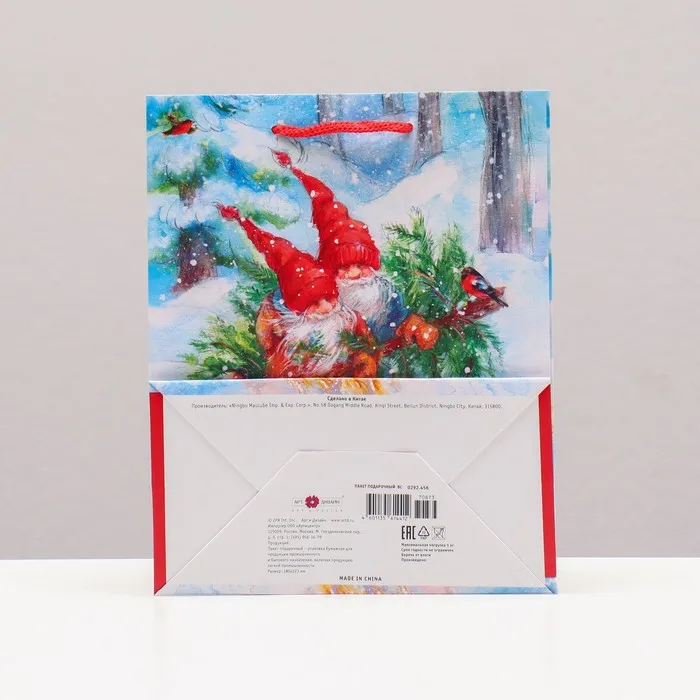 Новогодний подарочный пакет с ярким, красочным рисунком создаст праздничное настроение.