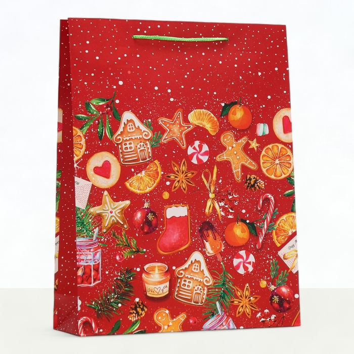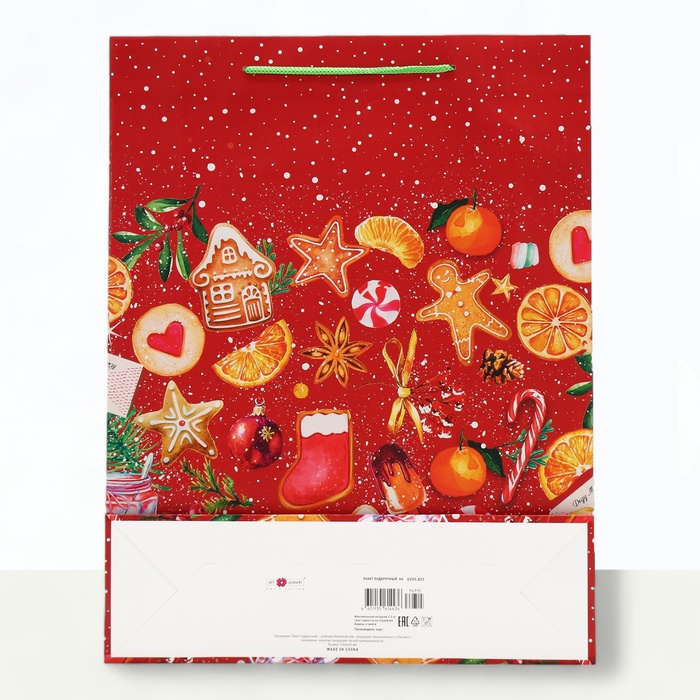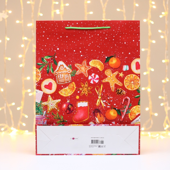 Новогодний подарочный пакет с ярким, красочным рисунком создаст праздничное настроение.