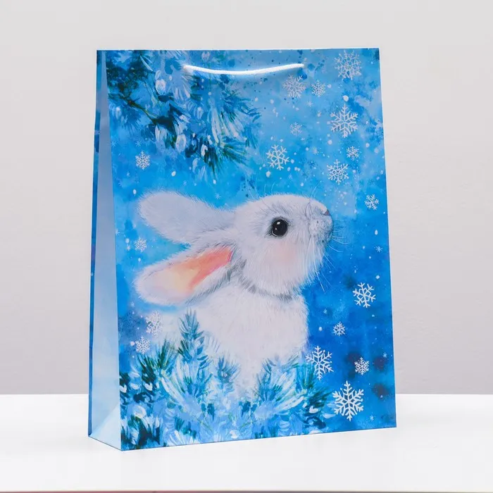 Пакет прямоугольной формы изготовлен из ламинированной бумаги.