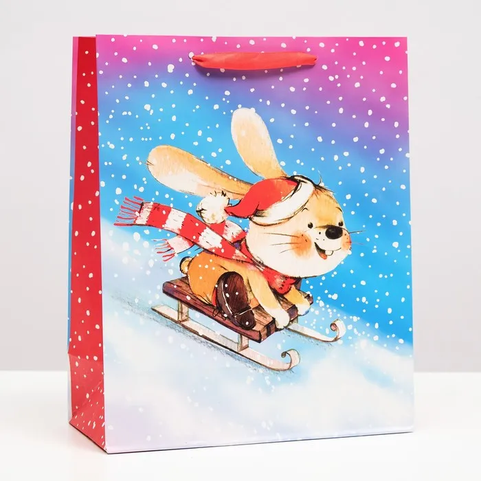 Пакет подарочный «Зайчик на санках» , 26×32×12 см