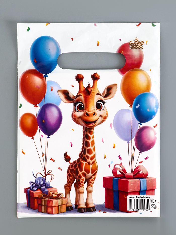 Подарок, который порадует малыша! Подарочный пакет «Жирафик» с вырубной ручкой — это яркая и прочная упаковка для детских праздников. Веселый рисунок с животными и воздушными шарами создает настроение радости и подходит для мальчиков и девочек.